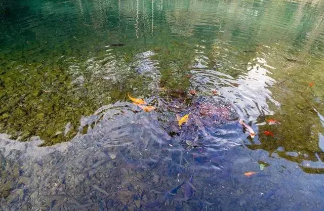 鱼水亲人:九鼎龙潭河水清澈,鱼群在水中争先恐后嬉戏其间,且与人特别亲昵。