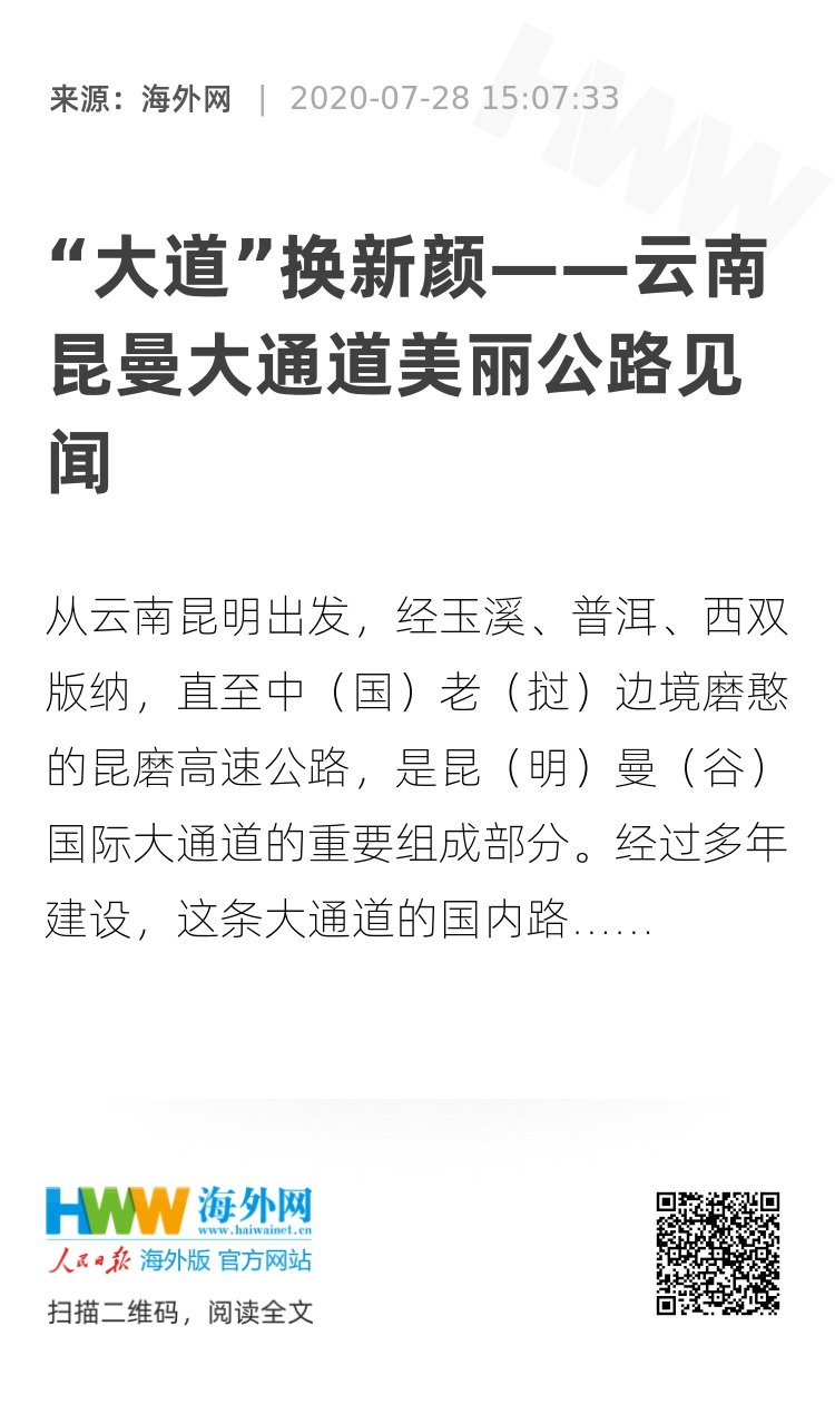 从云南昆明出发,经玉溪、普洱、西双版纳,直至中(国)老(挝)边境磨憨的昆磨高速公路,是昆(明)曼(谷)国际大通道的重要组成部分。经过多年建设,这条大通道的国内路段已于2017年实现全程高速。