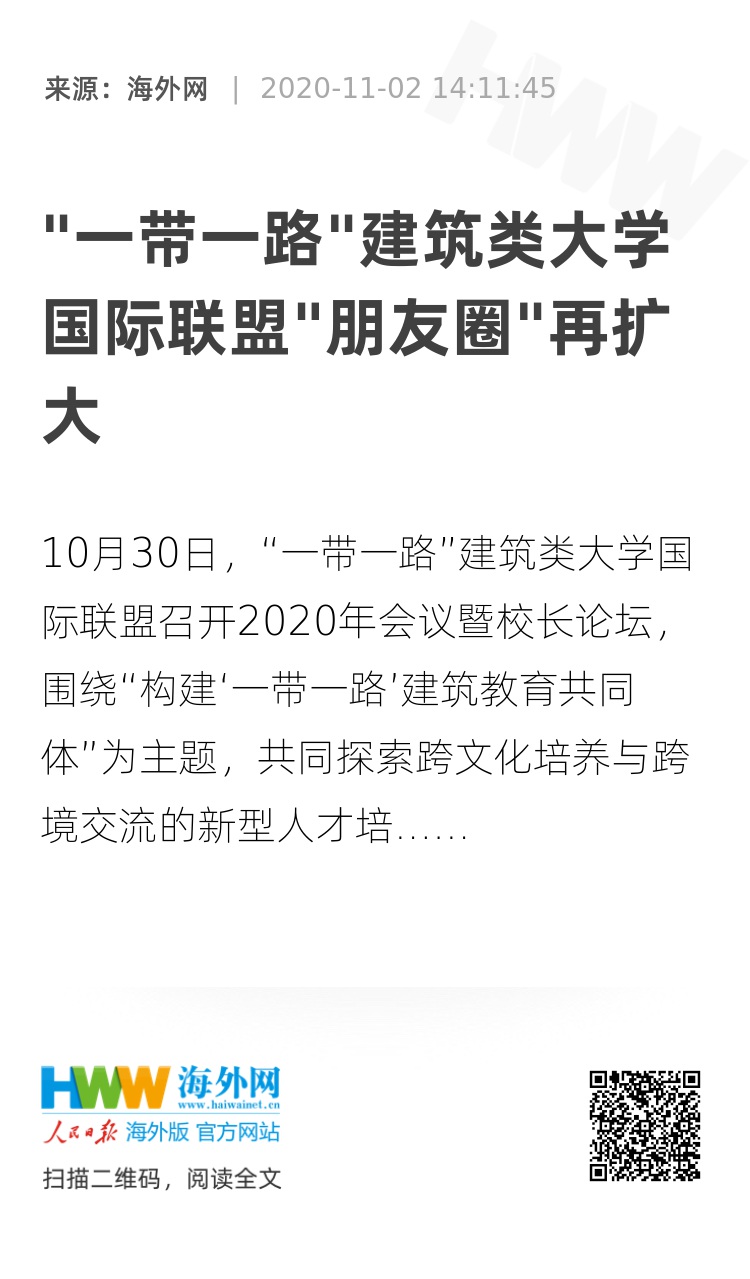 10月30日,“一带一路”建筑类大学国际联盟召开2020年会议暨校长论坛,围绕“构建‘一带一路’建筑教育共同体”为主题,共同探索跨文化培养与跨境交流的新型人才培养模式,在合作办学、专业共建、联合培养、合作创新等方面达成共识,推动“一带一路”沿线国家建筑类大学的全面交流合作。会议由联盟主席单位北京建筑大学和法国犹尼亚高等工程师学院联合举办。
